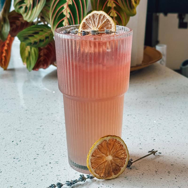 Bright, floral, and a little magical—this layered lemonade is mixed with lavender and herb-infused syrups, finished with a float of vibrant hibiscus rose tea for a stunning purple-to-gold fade.