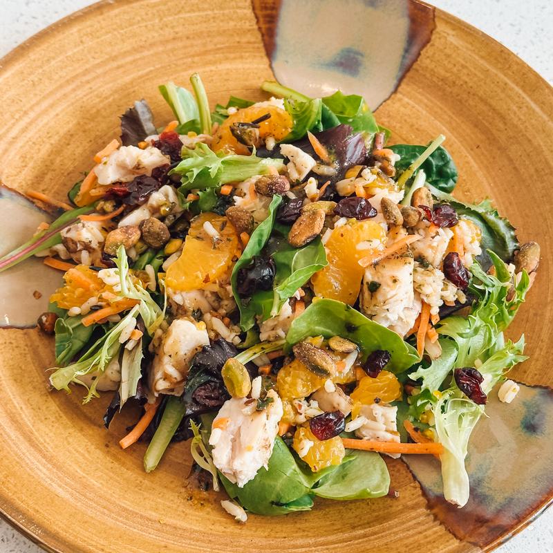 Healthy greens topped with tender chicken, long grain rice, sweet chili pistachios, carrots, mandarins, dried cranberries, and a flavorful basil vinaigrette. Choice of chips or fruit on the side. Gluten-free/Dairy-free