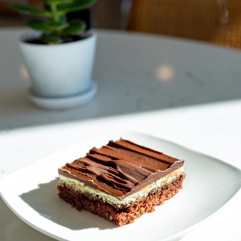 A decadent three-layer indulgence: a chocolate cake base, topped with a creamy mint buttercream, then finished with a silky chocolate icing.